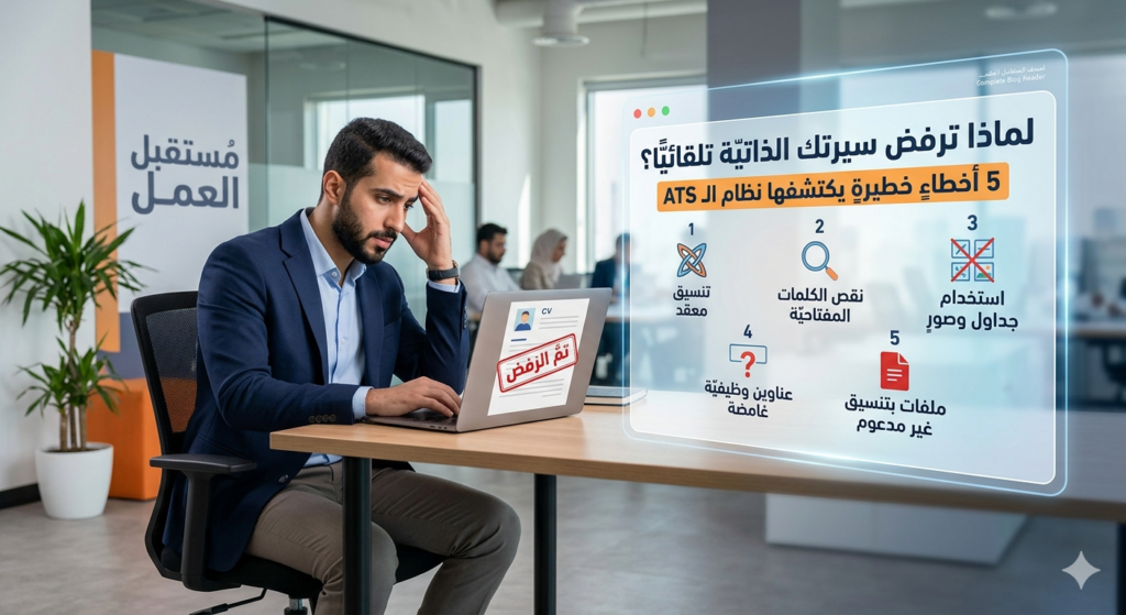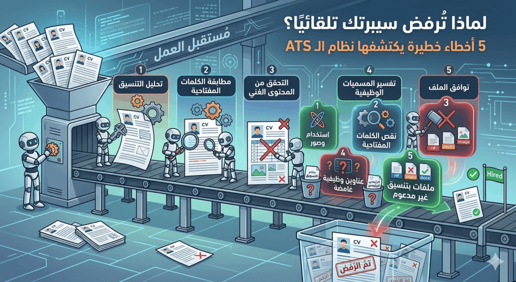 في هذا المقال ستتعرف على أهم 5 أخطاء يكتشفها نظام الـ ATS وتؤدي إلى رفض سيرتك الذاتية فوراً، وكيف يمكنك تجنبها لزيادة فرصك في الحصول على مقابلة عمل.
